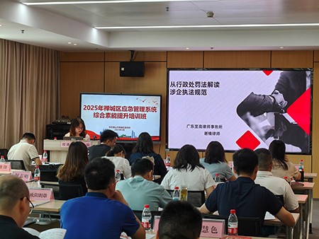 2025年6月27日,我所资深律师谢楠,凭借深厚的法律功底和丰富的实务经验,受邀为中共佛山市禅城区委党校的参训学员、各镇(街道)、区属有关单位负责应急管理等相关工作的业务骨干带来《从行政处罚法解读涉企执法规范》专项讲座,为提升行政执法人员法律素养、规范涉企执法行为注入专业力量。