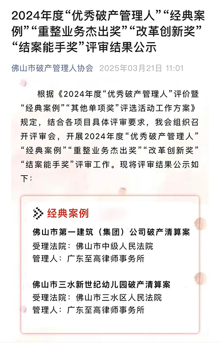 为进一步推进破产事业高质量发展,破解企业破产处置中的“实务盲区”和“规则真空”,通过系统梳理标杆案例的突破性价值,佛山市破产管理人协会联合佛山市两级法院开展了2024年度破产管理人评价暨“经典案例”及“其他单项奖”评选活动。其中,至高律所承办的“佛山市第一建筑(集团)公司破产清算案”以及“佛山市三水新世纪幼儿园破产清算案”两宗案件入选2024年度经典案例获奖名单。