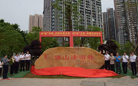 佛山法治林主题公园位于东平河水轴线上,面积近2300平方米,设有法治宣传设施,种植绿化树木逾百棵,生动展现了禅城区律师行业为禅城法治环境“绘绿图”,为营商环境“培沃土”,推动法治文化与绿色生态深度交融的美好愿景。